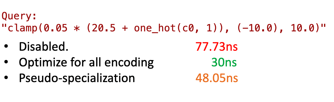 When the input vector is constant we can read the value always from index 0 of the values buffer, and when it is flat we can read it from the index row; this can be achieved by assigning a factor to either 0 or 1 and reducing the decoding operation per row into a multiplication with that factor Note that such a multiplication does not prevent simd. The graph above shows that the psudeo specialization makes the program 1.6X fatser wi, while the complete specialization makes the program 2.5X faster.